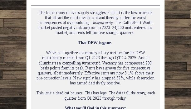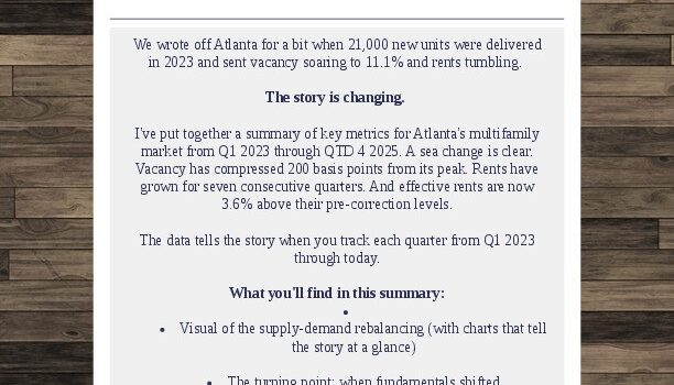 We wrote off Atlanta for a bit when 21,000 new units were delivered in 2023 and sent vacancy soaring to 11.1% and rents tumbling.Click to view full article. Read more